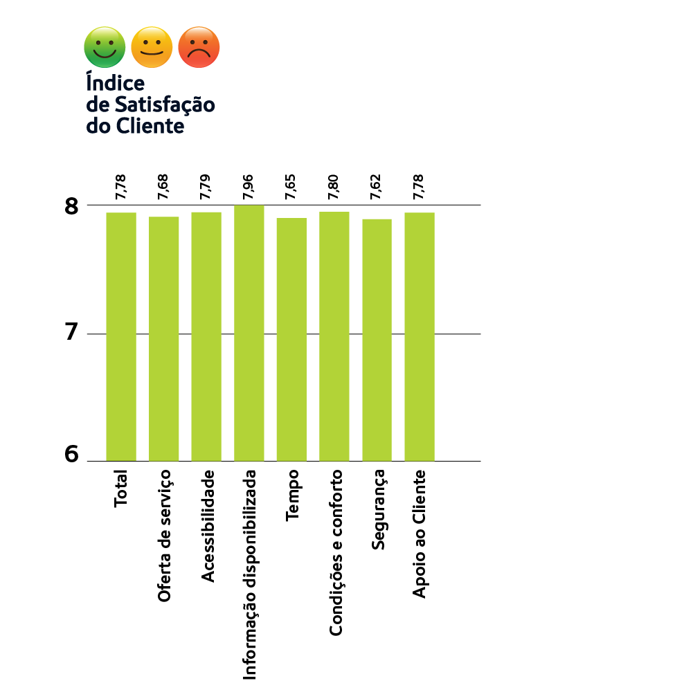 As componentes de serviço “Informação disponibilizada”, “Conforto” e a “Acessibilidade” são as que obtiveram os valores mais altos da avaliação efetuada pelos clientes do Metro. A “Oferta de serviço”, o “Tempo” e a “Segurança” foram as componentes mais valorizadas pelos nossos clientes.